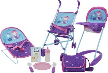 Mermaid 9 pcs Stroll, Feed n Play Set is a perfect role play set which includes a doll stroller, highchair, a bouncer, a matching handbag / diaper bag and feeding accessories for little parents to play with their favorite dolls and plush characters. The stroller folds easy for storage or travel, safety harness and double front wheels. As well as a doll highchair with a front feeding tray along with feeding accessories, a bouncer for relaxing and snoozing, matching diaper bag / handbag and feeding accessories. This all-in-one care set will provide tons of fun and fantasy play for little parents! For doll up to 16"(41 cm). **Doll not included**.