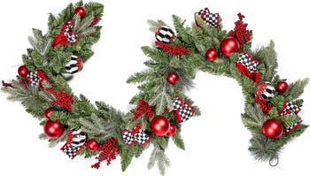 This festive Christmas garland brings a sense of delightful magic to your home with its classic greenery bedecked with red-trimmed Courtly Check ribbons, red baubles and warm, twinkling lights.