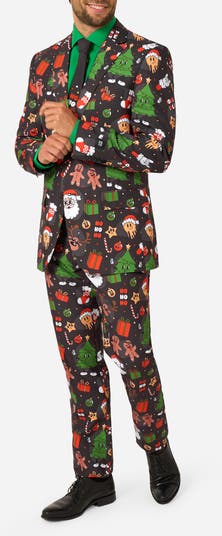 Everything you need for an unforgettable Christmas keeps you merry and bright in this suit covered in smiling Santas, crumbly cookies and unusually ornery ornaments. The jacket features padded shoulders and a traditional tailored silhouette, while the trousers sit comfortably at the waist and stay slim down the legs. The matching tie cinches the Christmas-coordinated look.