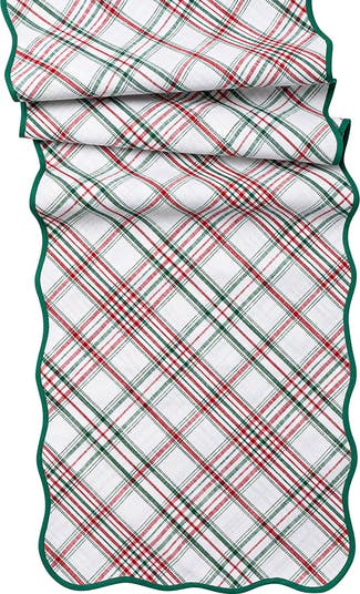 Scalloped edging and the season s favorite colors charm this plaid table runner that brings a cheery touch to your table.
