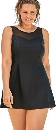 Comfort, coverage and style, all in one fashionable swimdress. The Mesh High Neck Swimdress has a flattering princess seam A-line silhouette with mesh inset detail. It’s expertly constructed with a full one piece swimsuit underneath, plus a built-in shelf bra for support and Power Mesh tummy-control front lining for smooth shaping.
