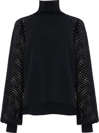 Soft texture, striking sleeves—this knitted sweater balances comfort with a touch of flair. The balloon mesh sleeves and relaxed high-neck shape make layering feel effortless.