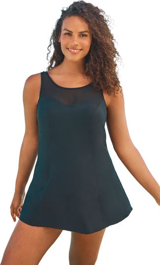 Pretty mesh accents and a flattering sweetheart neckline on our swim dress let you enjoy your time out in or out of the water. You ll enjoy superior comfort and support thanks to its fit-and-flare silhouette and front power-mesh lining. Built-in brief.