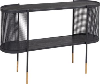 - Elevate any living space with this sleek and functional Metal Console Table with a Shelf for the TV featuring a handy shelf for extra storage and a smooth black finish for a contemporary look