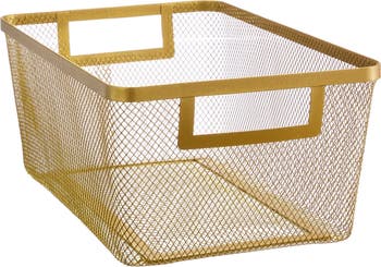 Enjoy quick access to your preferred ingredients with the Metal Mesh Pantry Basket, turning recipe card favorites into culinary delights. Sleek and highly versatile, this solution corrals small seasoning jars, snacks, or boxed foods so you never lose anything to the back of the pantry again. The metal mesh design and open-top concept allow for proper air circulation when storing fruits and vegetables and easy visibility to quickly inventory items inside without rummaging. Crafted from durable metal with built-in handles, these baskets transport easily and make a darling display when moved from the pantry to the countertop or kitchen table.