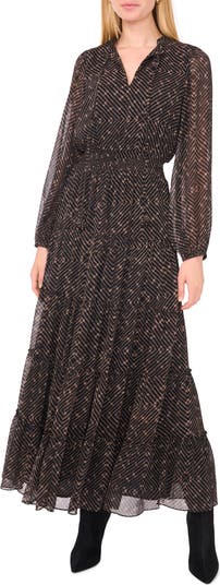 A tiered silhouette lends graceful drape to this polished maxi dress cut from gilded, chevron-patterned chiffon and shaped with a stretchy smocked waist.
