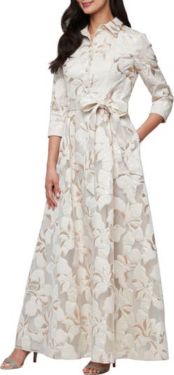 Enjoy the effortless wearability of a shirtdress with the elegance of a ballgown in this perfect blend of the two made from richly textured and glitteringly highlighted metallic jacquard and finished with a neatly tied bow at the waist.