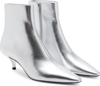 A snip toe and lustrous metallic upper create a futuristic aesthetic on a faux-leather bootie set on a sculptural kitten heel for a hint of height.