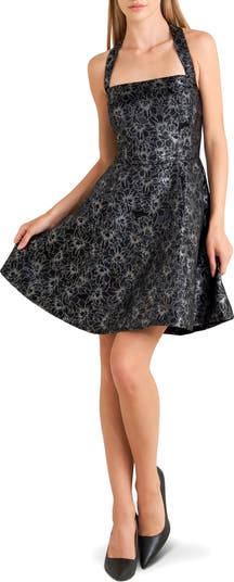 Swirling shimmering blooms enhance the allure of this party-perfect mini meant to show off your shoulders and back.