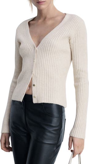 High-shine buttons contrast a soft cropped cardigan knit with allover ribbing for a close fit.
