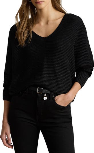 Fine metallic threads light up the ribbed stitches of this sweater knit with low dolman sleeves that further the slouchy, laid-back look.