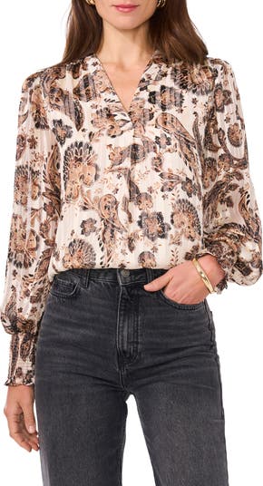 Shimmering stripes and pretty paisley animate a charming top set with ruffled sleeves.