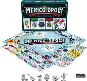 MEXICO-OPOLY: The game is in Spanish Only. Si bien es imposible incluir todo, incluimos todo lo que pudimos sobre MÉXICO en este juego! Compra tus propiedades favoritas en MÉXICO, aumenta el alquiler comprando varios ranchos e intercambiandolos por pueblos. ¿Suena fácil? Bueno, agrega algunas siestas, Calaveritas de Azúcar y el SAT y se pone un poco más difícil y mucho más divertido! Escoge tu ficha y avanza al espacio ¡VIVA MÉXICO! Pronto puedes ser Luchador del Año… o fuera del juego por comer demasiados elotes! ESTO ES MÉXICO… ¡Y ES TU JUEGO! While it’s impossible to include everything, we jammed all the Mexico we could into this game! Buy your favorite Mexican properties and increase your rent by collecting Ranchos and trading them in for Pueblos. Late for the Sky Mexico-Opoly Board Game is designed for all ages, Adults and Children.