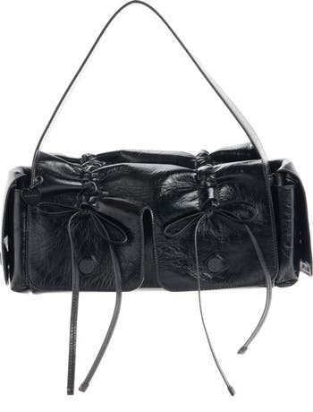 Texture and sheen collude to grab all the attention for this Italian-made baguette bag crafted from crinkled calfskin leather. The multipocketed construction is detailed with knotted lacing and jean-inspired embossed buttons for added gleam. A logo-engraved heart adds a playful signature to the look.