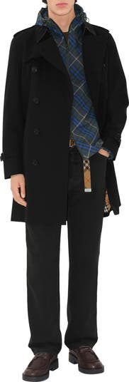 Characterised by classic proportions, the Kensington trench coat is tailored to a regular fit with structured shoulders. The heritage silhouette is crafted in England from shower-resistant cotton gabardine and lined with the iconic check – both woven at the Burberry mill in Yorkshire. More room at the chest and through the body allows for lightweight layering, ideal for the city wardrobe. Signature details, including epaulettes and leather-wrapped buckles, complete the design.||Double-breasted button closure|Hook-and-eye collar closure|Throat latch|Epaulettes|Storm shield at back|Gun flap at shoulder|Leather buckle belt and cuffs|Side button welt pockets|Back button vent|Burberry Check lining and undercollar|Comes with a garment bag