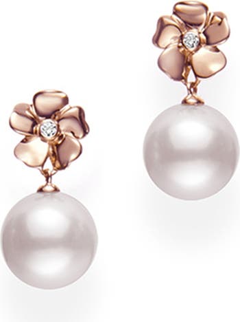 A dangling pearl creates movement in these earrings inspired by the Japanese cherry blossom with 18-karat gold blooms embellished by glimmering diamond centers.