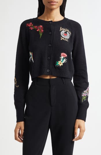 Beaded blooms and a message written in the language of love adorn a darling little cardi mostly made from soft cotton.