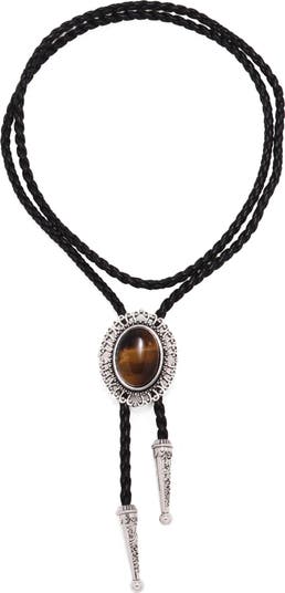 A faux tiger s-eye cabochon enhances the Southwestern charm of this wrapped bolo necklace anchored by a woven faux-leather cord with textured spike drops.