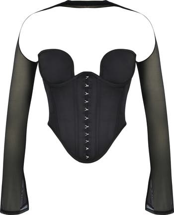 Hook-and-eye closures decorate the front of this structured corset-inspired top with a plunging neckline, lightly padded cups and stretch mesh long sleeves.