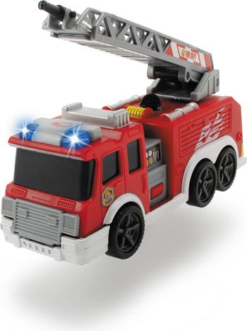 Dickie Toys - Mini Action Fire Truck Vehicle - Budding heroes with fire trucks to the rescue! Nee naw, nee naw - the Dickie Toys Mini Action Fire Truck brings the exciting world of the firefighter straight into the playroom. Less dangerous, but even more exciting, the bright red fire truck with ladder provides lots of scope for pretend play. A revolving telescopic ladder and water squirt function are enhanced by light and sound effects. This makes the fire truck with blue light a virtual carbon copy of its full-scale counterparts. The smooth-running freewheel mechanism ensures a speedy journey to the next destination. This gift sparks the imagination and trains the motor skills of children aged three and over. Discover our wide range of Mini Action Series toys for all age groups! Requires 3-Button Cell batteries that are included. WARNING: CHOKING HAZARD -- Small parts. Not for children under 3 yrs.