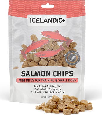 ICELANDIC+ MINI FISH CHIPS: SALMON - 2.5OZ Is your small pup always begging for treats? Need an enticing reward for good behavior? Capture your pup s attention and get them giving you paws up every time with the Icelandic+ Salmon Mini Chip Training Treats! Big crunch, big taste, and is low in calories for small dogs watching their weight or pups working on their manners. Our Mini Salmon Chips are healthy treats made with sustainably caught salmon and pollock. Features: Excellent training treat or for small dogs, made without fillers, additives or preservatives, Two ingredient snacks, Air dried to lock in nutrients using geo-thermal energy, Only fish – for picky eaters and dogs with sensitivities, Satisfying crunchy mini bite-sized chips, Grain-free, 100% natural, Made using the same process as the Vikings did in 900 AD. Get your pet hooked on delicious, healthy Icelandic+ 100% natural, single ingredient fish treats. Ideal for pets with protein sensitivities, our all-natural fish treats are sourced daily from the pure waters of Iceland, and then immediately cleaned, air-dried, and processed. Promoting healthy gums and teeth by reducing tartar and plaque build-up, while also providing Omega-3 fatty acids to help improve your pet’s healthy skin and coat, Icelandic+ fish treats are the treat that will have your pet wagging for more.