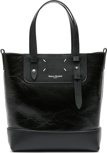 D-ring hardware and saddlery-inspired adjustable top handles bring an equestrian element to this compact leather tote detailed with the maison s anti-label four stitches.