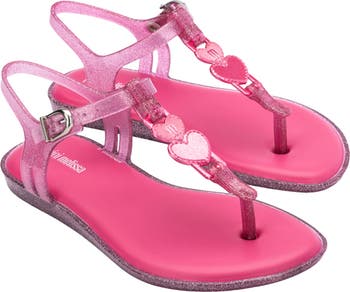 Perfect for a day of fun in the sun, this jelly thong sandal with a signature tutti frutti scent further charms with a glittery finish and shining heart hardware at the T-strap.