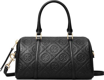 Tory s signature stacked-T medallions are embossed in a quilting-inspired design across the richly pebbled surface of this scaled-down leather barrel bag.