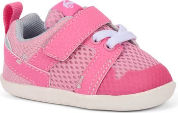 Made to be lightweight and flexible with breathable mesh inside and out, this sporty sneaker features a wide flat sole to encourage confident first steps.