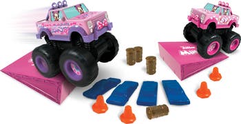 Minnie is ready and rearing to go on some off-road Monster Truck adventures! The Disney Junior Minnie Monster Trucks have great Minnie Mouse colors and styling. With 2 Minnie friction-powered Monster Trucks, kids can create their own off-road adventures. Drive through the cones and barrels, jump the ramp, or just race around the floor! With the Switch Ems designed vehicles, kids can take the truck body off the chasis and switch em to another chasis to mix and match the truck colors. 18 total pieces, including the switchable chasis to mix up the fun, it s time for some Disney off-roading!
