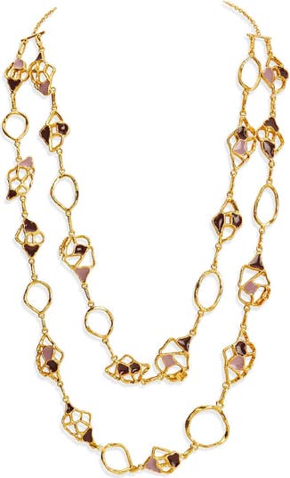 Crafted in heavily textured brass resembling undulating lands with shades of purple enamel peaking through, this versatile necklace is completed with 22k yellow gold micron plating. This beautiful lightweight, statement necklace can be worn in layers or as one long chain that cascades down and is a heavier version of the Miva Necklace.