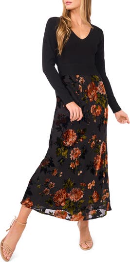 Perfect for cooler days and nights out, this charming fit-and-flare dress pairs a solid V--neck top with a burnout skirt graced by bold blooms.