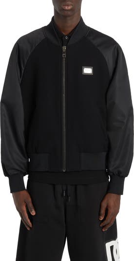 A gleaming nameplate punctuates the chest of a faux-down-insulated bomber jacket emboldened by a mixed-media design.