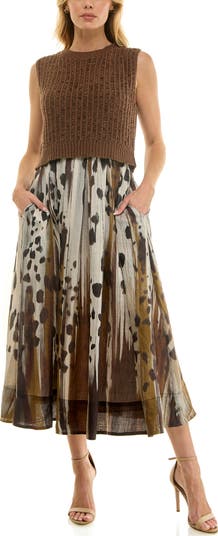 A mixed-media design creates a layered, two-in-one effect on this pleated midi dress fashioned with a swingy skirt.
