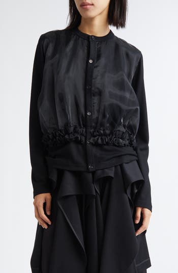 Kei Ninomiya proves his status as an icon of experimental fashion with this ruffle-trimmed cardigan that combines smooth wool jersey and crisp, translucent organdy into one bold statement.