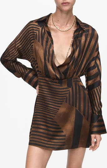 Shirtdress style gets sultry with a leg-baring length and a deeply dipped neckline.