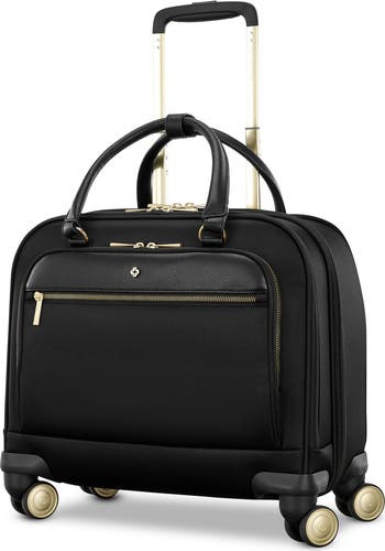 Your office, elegantly on the movethe Spinner Mobile Office is compact yet impressively durable and capable, keeping you organized wherever work takes you. Inside, it features a padded laptop sleeve, file pockets, and compression straps. A large front zippered pocket and a smaller exterior zippered pocket with a USB passthrough and organizer keep your tech and accessories within reach. Finished with champagne hardware and smooth-rolling wheels, it offers streamlined function with elevated style. The built-in StackIt strap lets you secure it to your rolling luggage for easy, hands-free travel.
