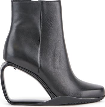 The Mobius Bootie is a zippered ankle boot featuring a sleek leather upper, a monotone silhouette and United Nude s signature Mobius heel. The fiber-reinforced nylon heel is the strongest part of the shoe, while its open wedge shape keeps it incredibly light. The popular style returns this season with an updated toe cap shape. United Nude s launch product, the Mobius, was revealed in 2003 and has since become an icon in the world of design. The style was born from a conceptual development of the Möbius strip, a single-sided surface with no boundaries. Its distinct shape was inspired by transforming the frame of Mies van der Rohe s Barcelona Chair into a single band, uniting the upper, sole, footbed and heel into one infinite piece.