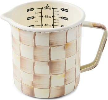 Hand-painted color-dragged checks bring a playfully retro vibe to this enameled-steel measuring cup that makes cooking and baking a more stylish endeavor.
