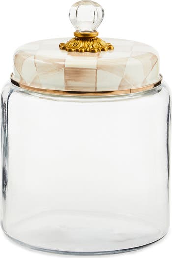 Keep countertops tidy with this glass canister sealed off with a check-painted lid.