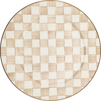 Add a touch of sophistication to your garden parties or evening dinners with this round serving tray hand-painted with signature Mocha Checks. The tray is made from heavy-gauge, hand-glazed steel and rimmed in bronzed stainless steel.