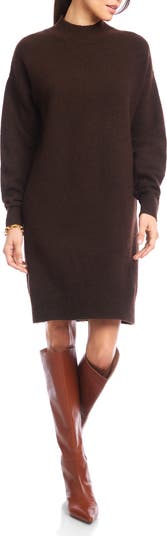 A slouchy-yet-chic wool-kissed sweater-dress is framed by soft ribbing and topped by a polished mock neckline.