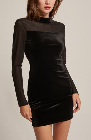This mini dress features a mock neckline, long sleeves, and a fitted bodice. The back keyhole and button closure offer a simple detail that complements its clean, modern shape.