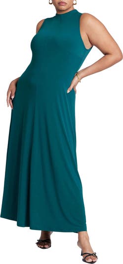 A hint of stretch adds shape-retaining power to this sleeveless matte-satin maxi made with a sophisticated mock neck and a flowy flared skirt.