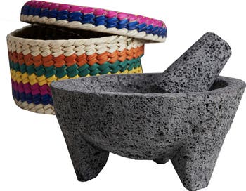 - Each molcajete is packed in a tortilla basket made of handwoven palm leaves to serve in style.