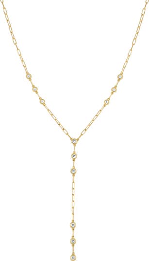 Round diamond bezels trickle down the front of this handcrafted Y-necklace made from elongated links of 18-karat gold.