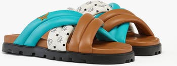 Italian lamb leather cross strap sandals with Visetos monogram print and Laurel hardware