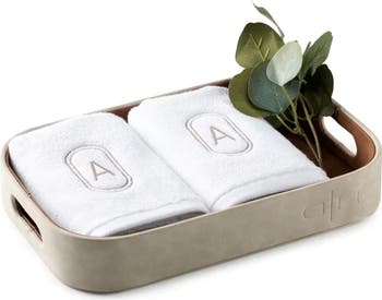 A duo of monogrammed guest towels made of plush cotton are housed in a suede-and-leather tray to make guests feel welcome.