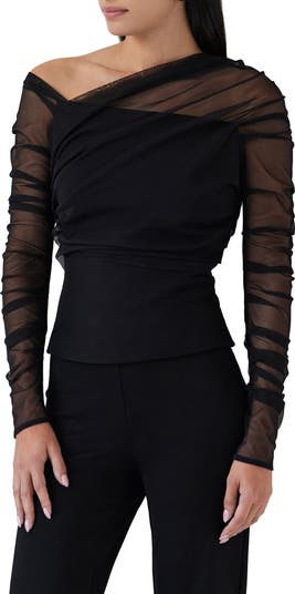 A light-as-air mesh overlay drapes across this one-shoulder top cut with shapely ruching and a ponte base layer that hugs your curves.