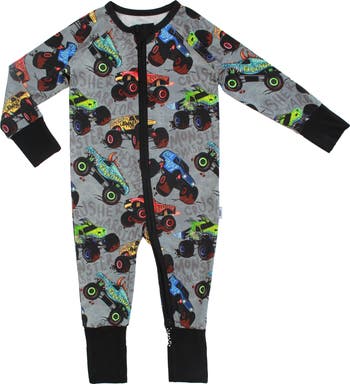 Convertible one piece footed romper in buttery soft viscose. Featuring bold monster trucks for your action-packed little who s ready to smash it up from the streets to the sheets.